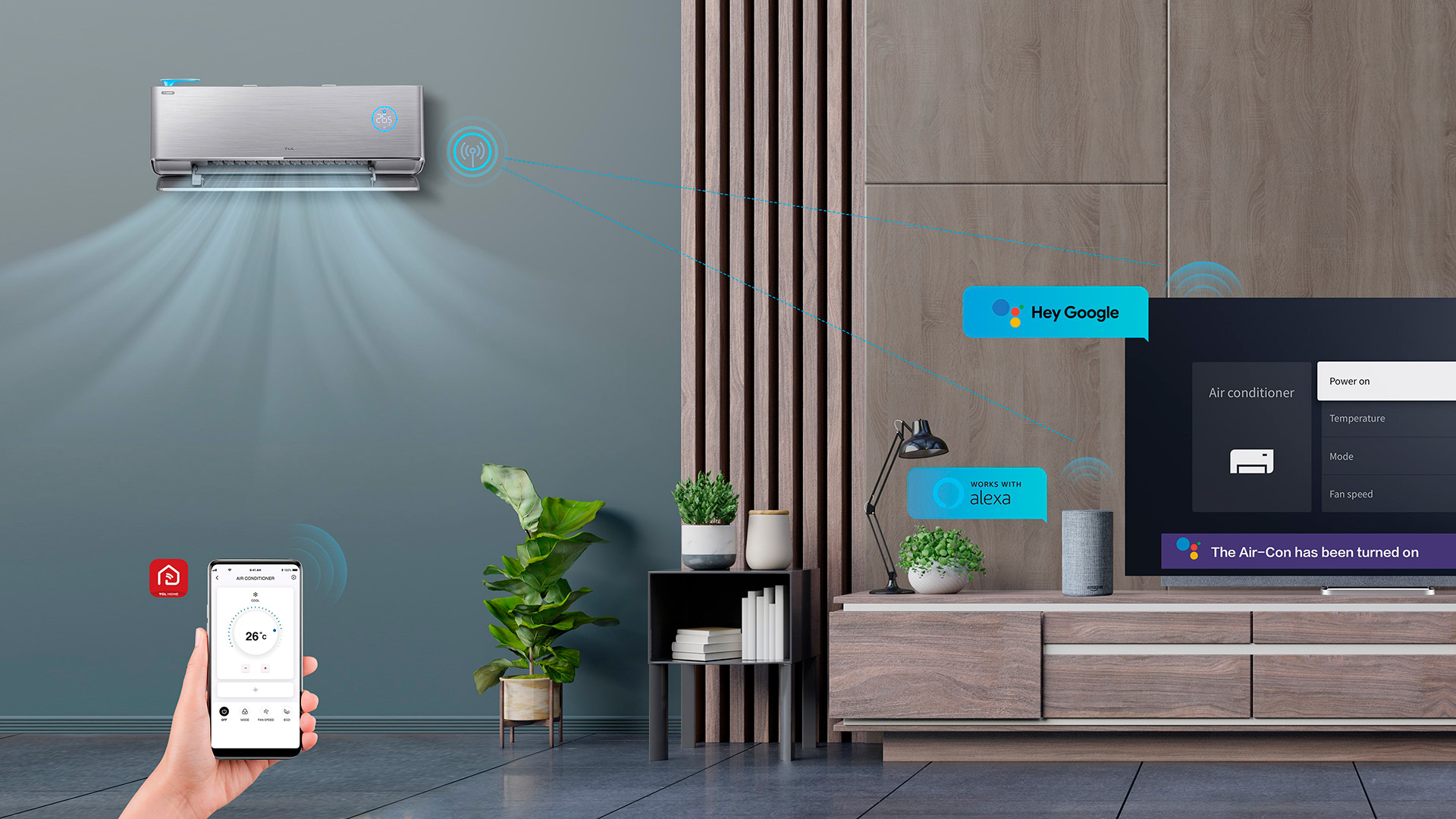 Funkciju tālvadība, izmantojot TCL Home lietotni, vai vadība ar vienkāršām balss komandām. TCL Home lietotne var arī reāllaikā parādīt svaigā gaisa daudzumu.